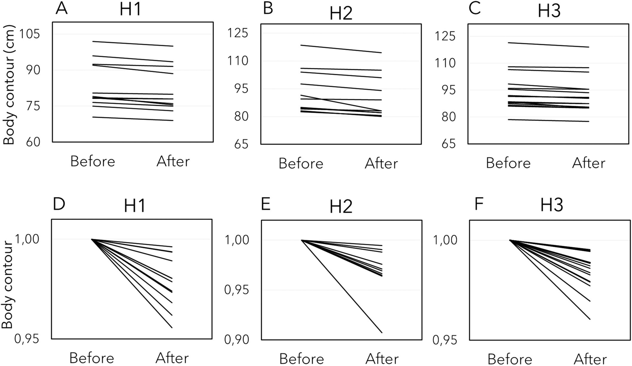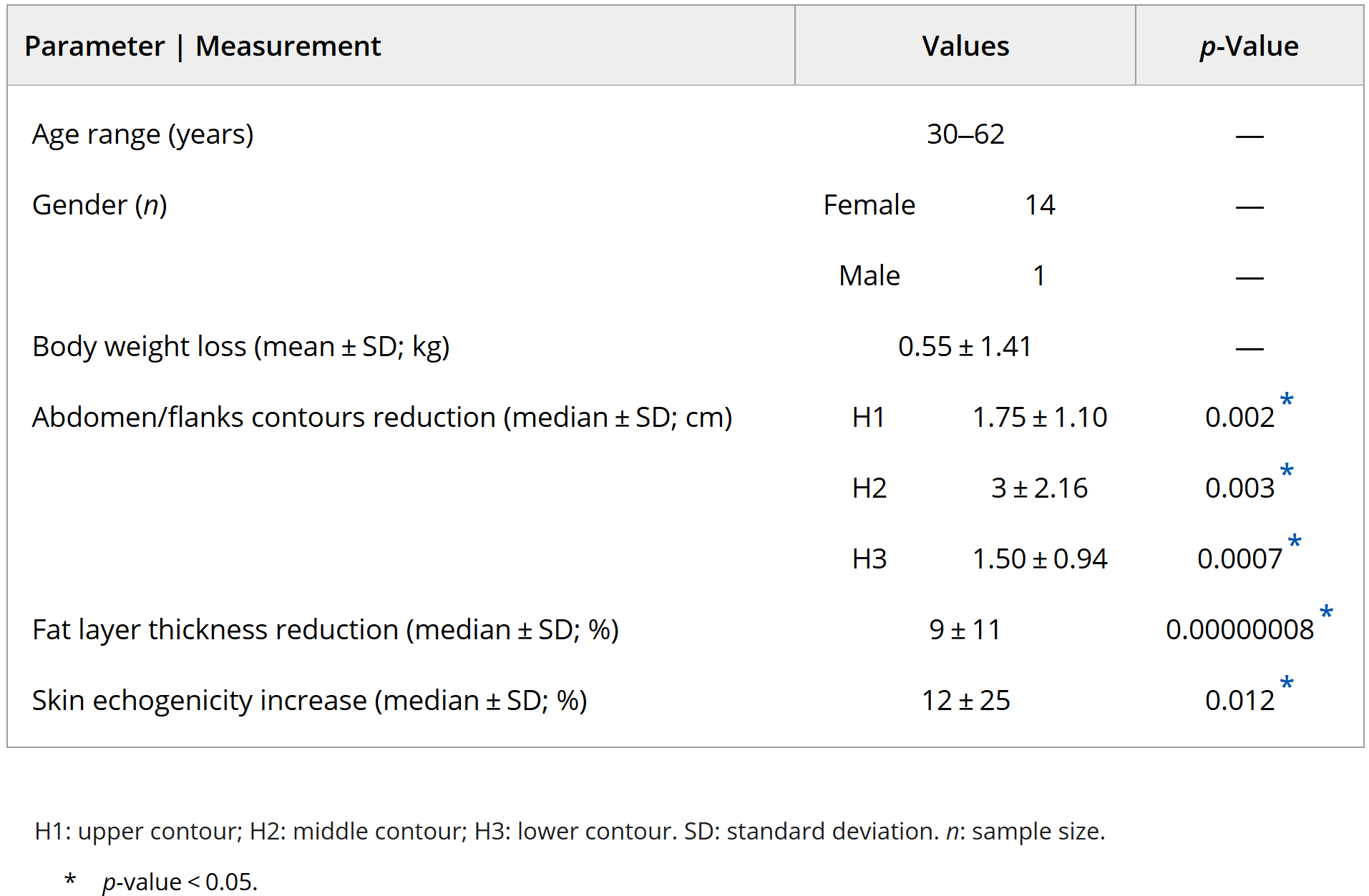 - Số đo chu vi cơ thể được đánh giá trong điều kiện chuẩn hóa ở 3 độ cao khác nhau của bụng/hông (Hình 1; Bảng 1). Ở vùng trên (H1), trung bình quan sát thấy giảm đáng kể 1,75 ± 1,10 cm (2%; dao động: 0,30–3,50 cm) (W = 78; p = 0,002; r = 0,88). Ở vùng giữa của vùng được điều trị (H2), trung bình quan sát thấy giảm 3 ± 2,16 cm (3%; dao động: 0,50–8,50 cm) (W = 66; p = 0,003; r = 0,88). Ở phần bụng/hai bên hông dưới (H3), người ta quan sát thấy mức giảm trung bình là 1,50 ± 0,94 cm (1%; phạm vi: 0,50–3,50 cm) (W = 120; p = 0,0007; r = 0,88).