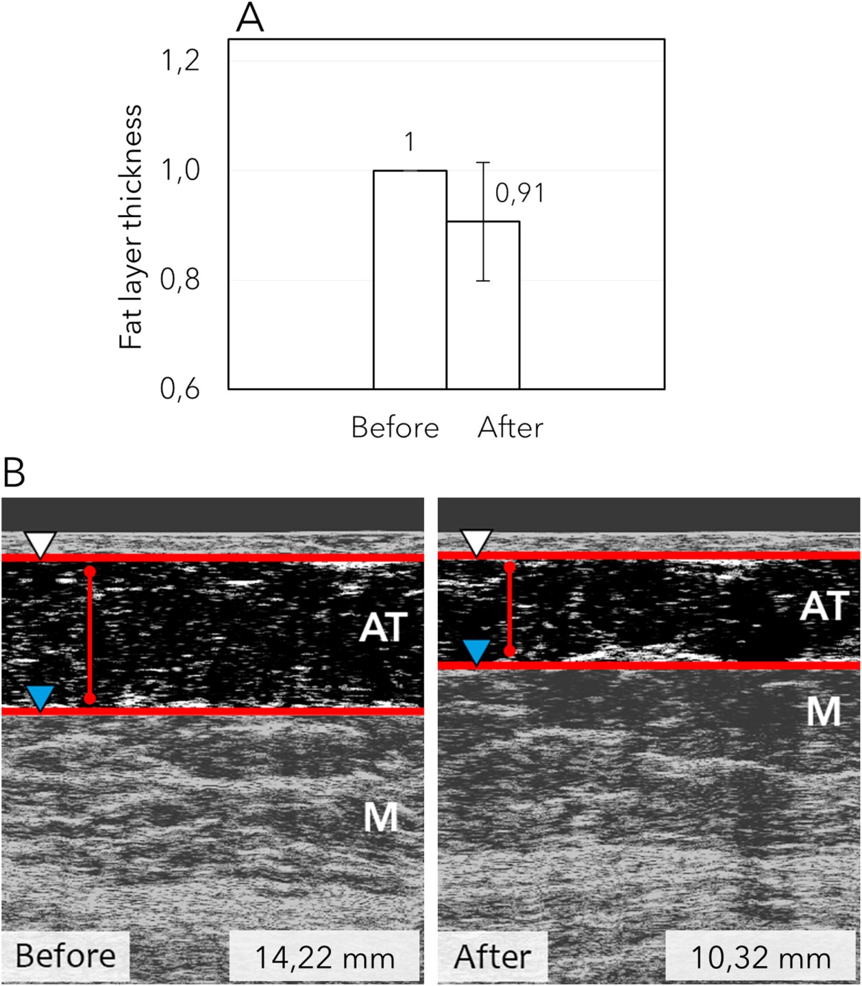 - Độ dày lớp mỡ dưới da được đo bằng khoảng cách (mm) giữa đường trung bì sâu và màng cân sâu (Hình 2; Bảng 1) tại thời điểm ban đầu và buổi theo dõi. Sau 8 buổi, độ dày mô dưới da ở bụng/hai bên hông giảm đáng kể, trung bình 9 ± 11% (W = 741; p = 0,00000008; r = 1,39).