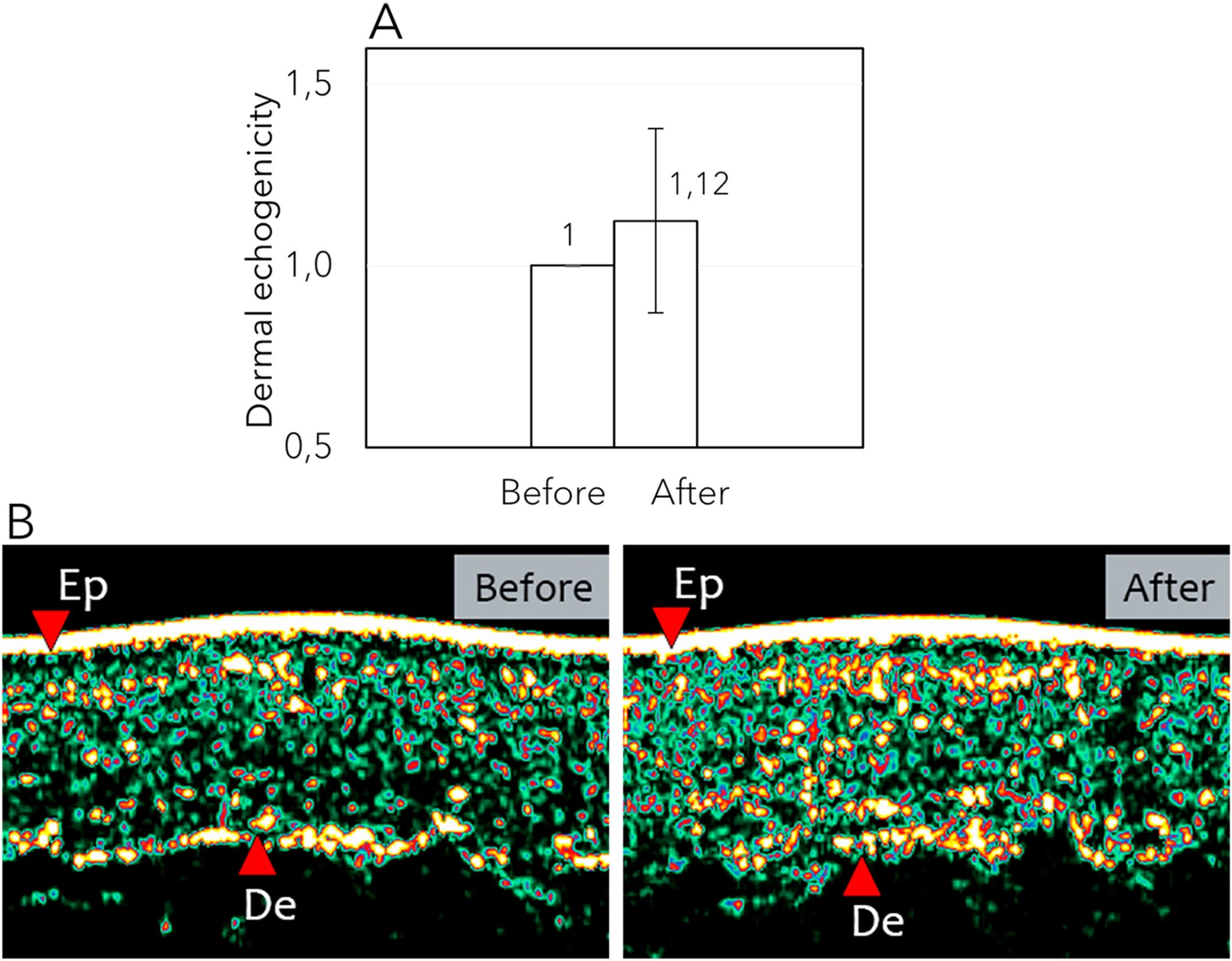 - Độ hồi âm của da được đánh giá bằng đầu dò siêu âm (Hình 3; Bảng 1). Kết quả được sử dụng như một phép đo gián tiếp lượng collagen hiện diện trong lớp trung bì. Sau khi điều trị, DE tăng trung bình 12 ± 25%, với giá trị tối đa là 74%. Sự gia tăng này thể hiện sự cải thiện đáng kể về độ hồi âm của da (W = 19; p = 0,0125; r = −0,63).