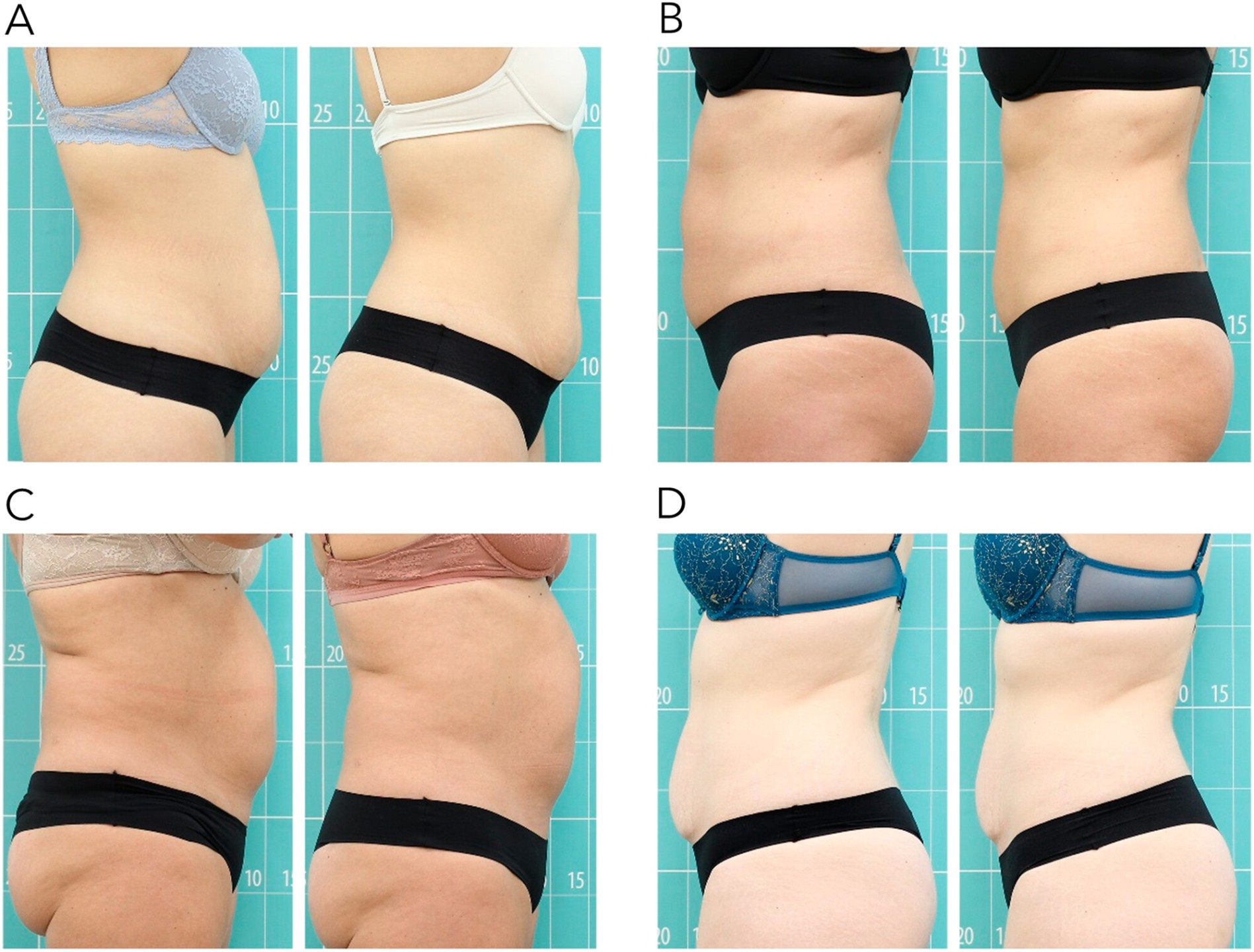 - Phân tích thị giác về hiệu quả điều trị được thực hiện bằng cách sử dụng ảnh chụp từ các góc độ khác nhau (Hình 4). Kết quả đánh giá ảnh chụp mù cho thấy tỷ lệ thành công trung bình là 84,45 ± 3,85% (80,00–86,67%) khi người đánh giá nhận diện được các hình ảnh được chụp trước khi bắt đầu điều trị. 86,67% ảnh chụp được ít nhất 2 trong số 3 người đánh giá nhận diện chính xác. Về mặt thị giác, sau khi điều trị ở vùng bụng/hai bên hông, tình trạng da chảy xệ đã giảm, do đó cải thiện diện mạo tổng thể của da. Sự giảm thể tích cơ thể ở vùng điều trị cũng rất đáng chú ý ở một tỷ lệ cao người tham gia.